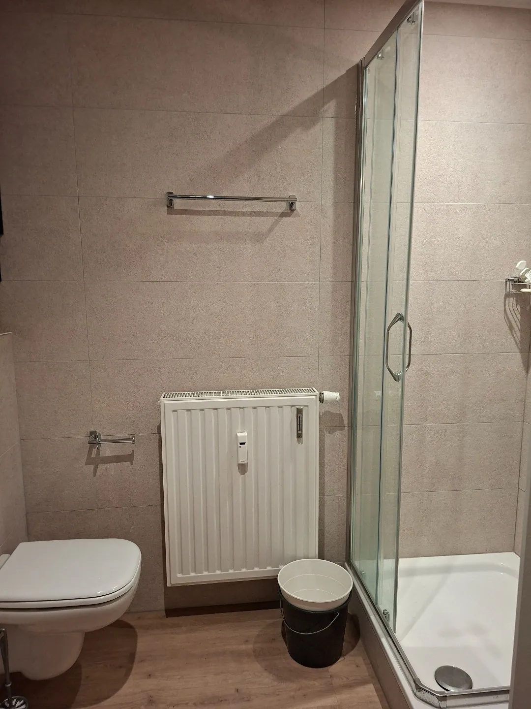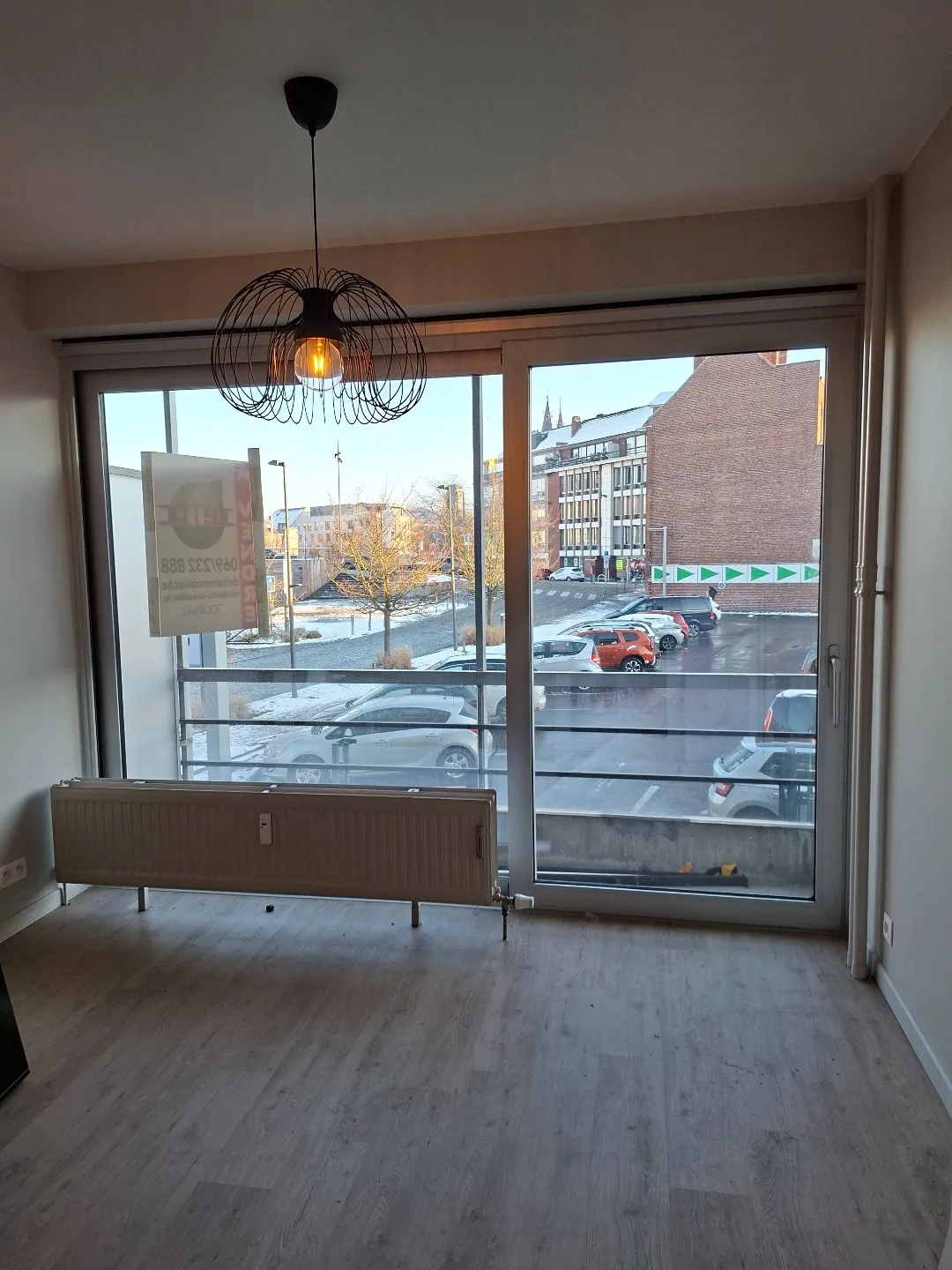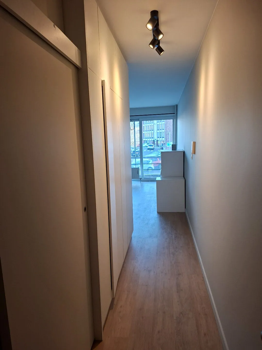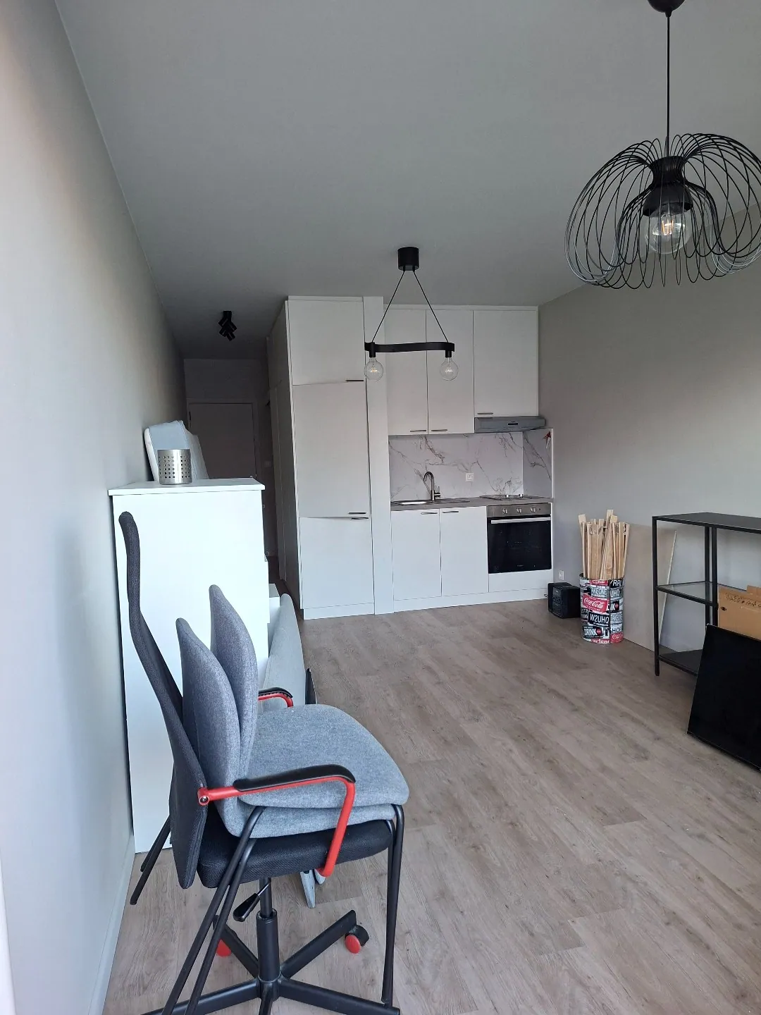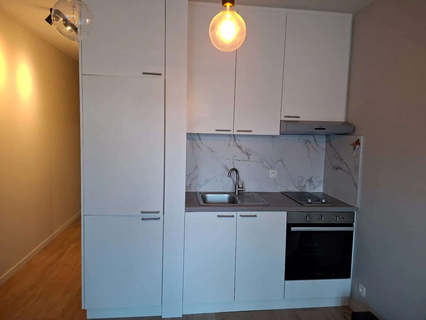 Hall, salle de douche neuve, placards/vestiaire, séjour avec cuisine neuve, balcon/terrasse.